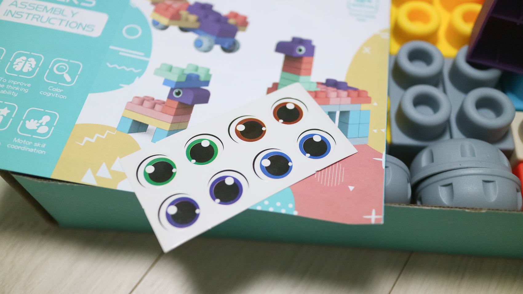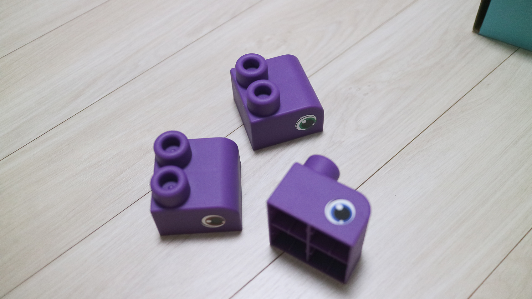 눈 모양 스티커는 곡선이 있는 얼굴 모양의 보라색 블록에 눈처럼 붙여서 사용할 수 있습니다. 동물이나 공룡과 같은 파스텔톤의 부드러운 아기 블록으로 만들 수 있기 때문에 얼굴 블록 눈 스티커는 필수입니다.