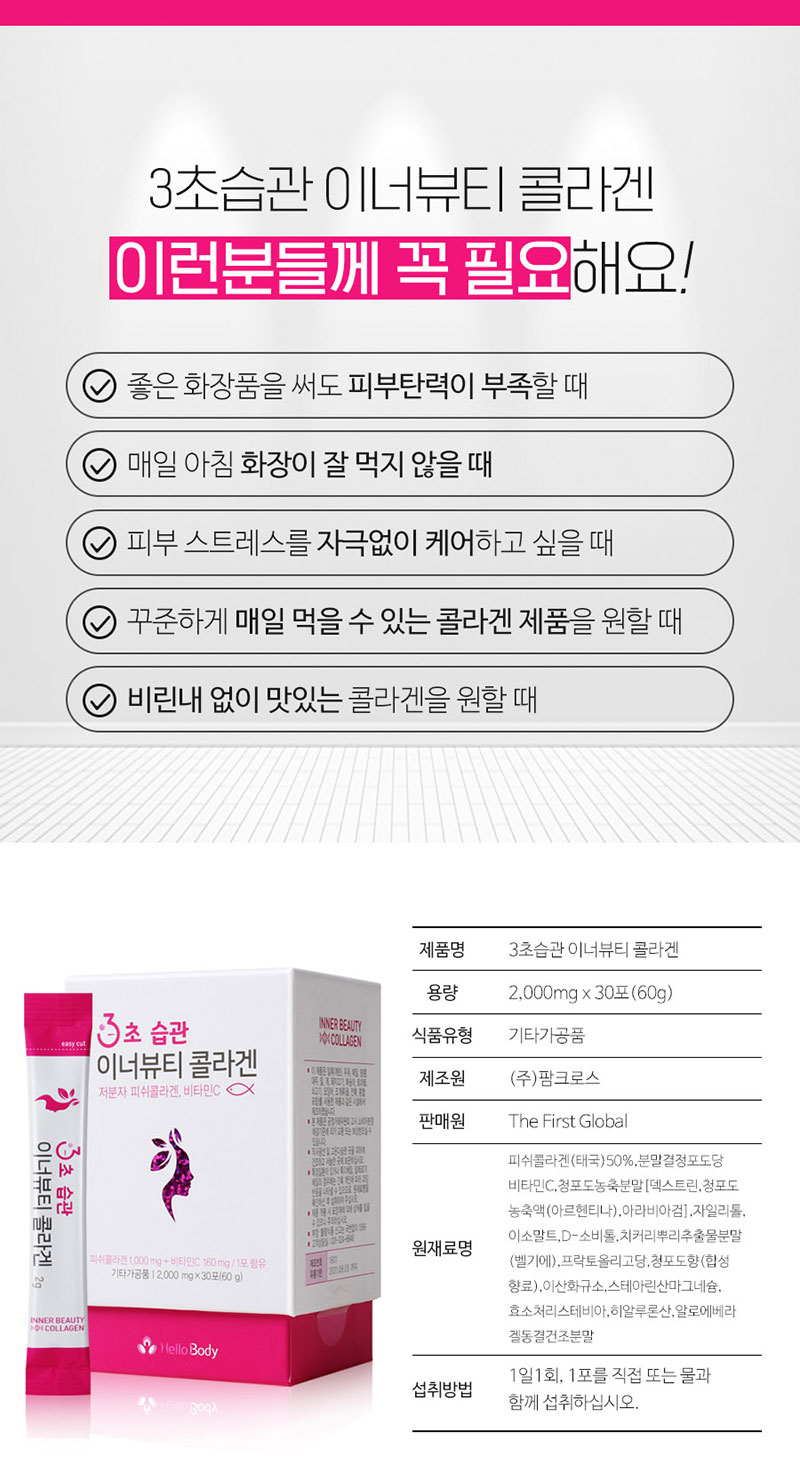 20대부터 피부의 콜라겐이 감소합니다. 어느덧 피부를 놓을 수 없는 나이가 된 20대. 그래서 꾸준히 콜라겐을 섭취하고 있어요 🙂 이번에는 뷰티인사이드 저분자 피쉬 콜라겐 파우더를 섭취하고 있어요. 하루하루 브랜드에서 출시한 저분자 콜라겐 “하루하루 콜라겐!”입니다.