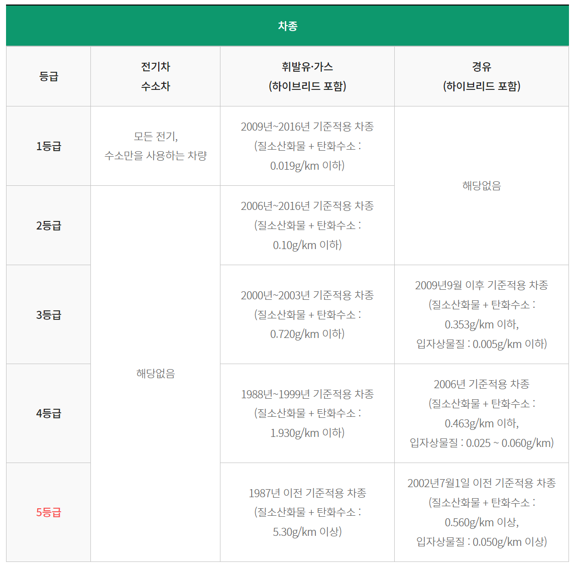 단순 차령을 기준으로 한 등급이 아닌 배기가스 기준을 적용한 5개 등급입니다. 공해물질을 많이 배출하거나 미세먼지 농도가 높은 차량인 경우 5등급으로 분류것이 가능하다.